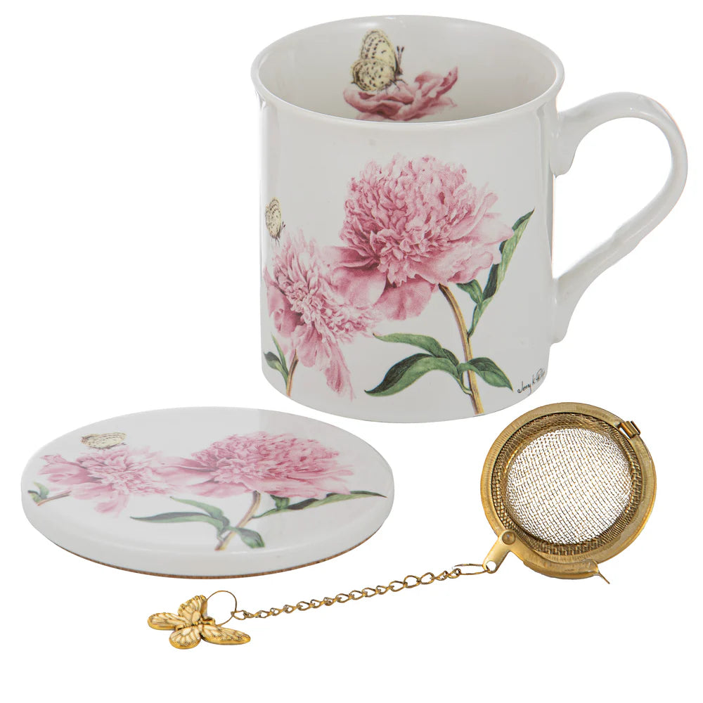 Gorgeous floral mug gift sets by renowned Australian artist Jenny Phillips includes a beautiful floral mug, matching coaster and a handy tea ball with a delicate butterfly charm.